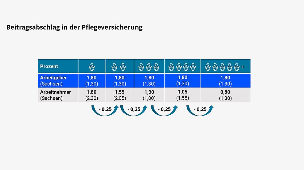 Für Arbeitnehmer mit Elterneigenschaft reduziert sich der Beitragssatz zur Pflegeversicherung für jedes berücksichtigungsfähige Kind ab dem zweiten Kind bis zum fünften Kind um jeweils einen Beitragsabschlag in Höhe von 0,25 Beitragssatzpunkten: