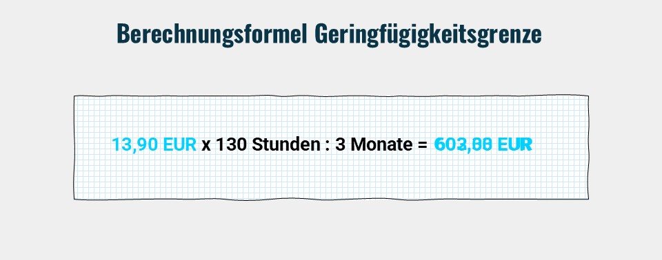 Berechnung: Als dynamische Obergrenze für einen Minijob orientiert sich die Geringfügigkeitsgrenze an einer Wochenarbeitszeit von 10 Stunden zum gesetzlichen Mindestlohn. Der gesetzliche Mindest-Stundenlohn wird mit 130 Stunden (13 Wochen pro Quartal multipliziert mit 10 Stunden) vervielfacht, durch 3 Monate geteilt und der sich daraus ergebende Betrag wird auf volle Euro aufgerundet. Eine wöchentliche Arbeitszeit von 10 Stunden entspricht einer Arbeitszeit von 43 Stunden und 20 Minuten im Monat.