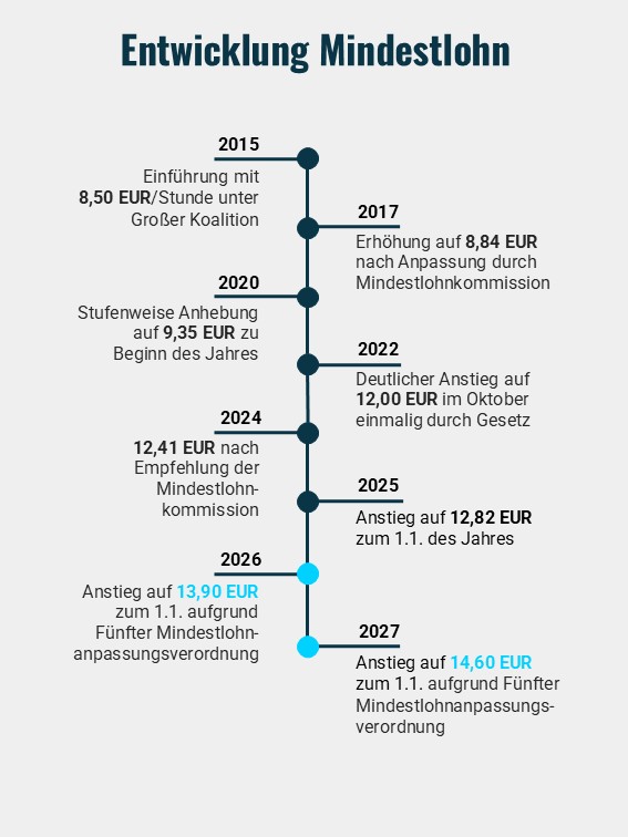 Die Mindestlohnkommission hat alle zwei Jahre über eine Anpassung der Höhe des gesetzlichen Mindestlohns zu beschließen (§ 9 Abs. 1 MiLoG) – heißt also bis zum 30. Juni 2025 für die Jahre 2026 und 2027. Am 27. Juni 2025 erfolgte der fünfte Beschluss mit einer Erhöhung in zwei Stufen (jeweils brutto je Zeitstunde):